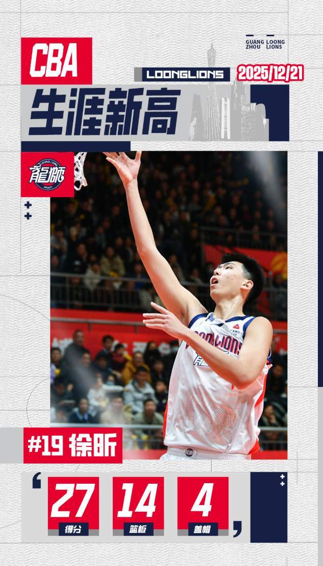 - 2025年12月21日 广州送江苏4连败 徐昕新高27+14&4帽 威金顿27+6 庞峥麟18分