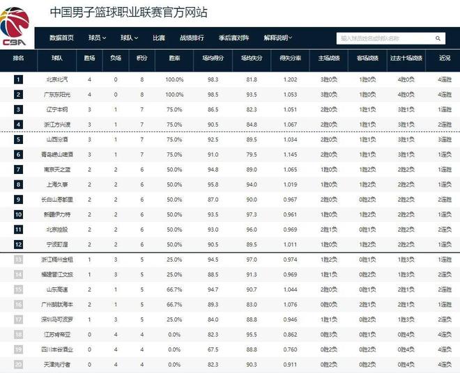 CBA最新排名!北京广东四战全胜,辽宁第三上海第八,三队0胜