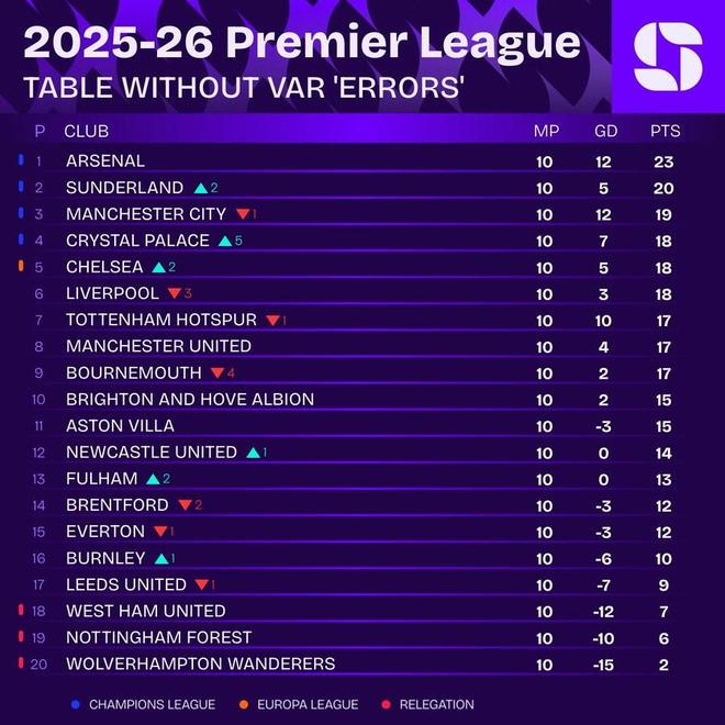 Squawka每周让球迷投票选出最具争议的VAR判罚。去除了这些争议VAR判罚,英超前十轮的英超积分榜中,切尔西将积18分来到第五位,利物浦将同积18分排名第六。